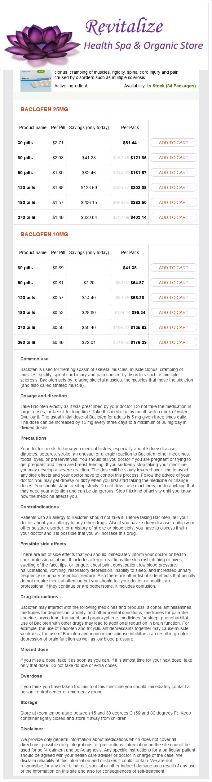Baclofen packs: 30 pills, 60 pills, 90 pills, 120 pills, 180 pills, 270 pills, 360 pills