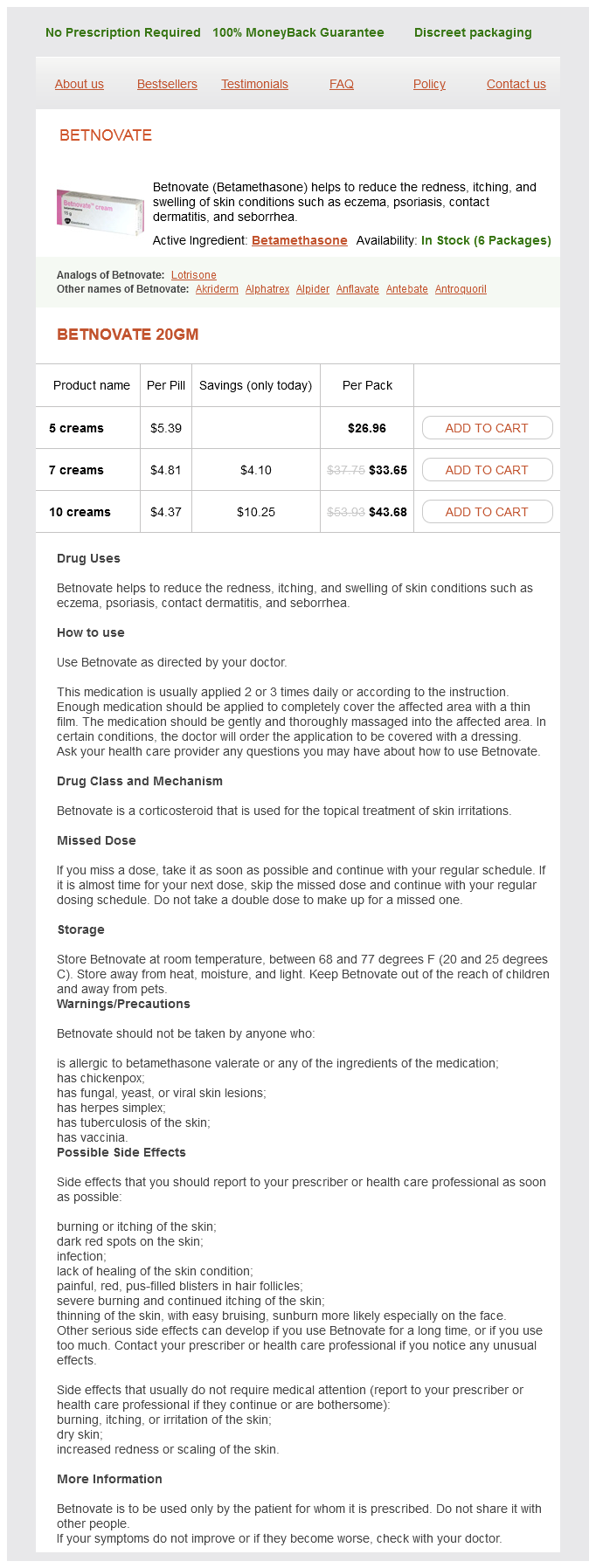 Management of chronic adrenal insufficiency in adults is with the daily oral administration of cortisone acne varioliformis betnovate 20 gm purchase with visa, 25 skin care japan buy betnovate 20 gm with visa. Topical corticosteroids are capable of potent antiinflammatory effects and are the mainstay of allergic therapy. Asthma is an inflammatory disease of the lungs and inhaled glucocorticoids are often recommended as first-line therapy for controlling the symptoms. Inhaled glucocorticoids have oropharyngeal side effects that include dysphonia and candidiasis. Parenteral corticosteroids are important in the emergent preoperative preparation of patients with active reactive airway disease and in the treatment of intraoperative bronchospasm. Doses equivalent to 1 to 2 mg/kg of cortisol (or the equivalent dose of prednisolone) are commonly recommended. Preoperative corticosteroid administration 1 to 2 hours before induction of anesthesia is important because the beneficial effects of corticosteroids may not be fully manifest for several hours. Dexamethasone prevents postoperative nausea and vomiting only when administered near the beginning of surgery, probably by reducing surgery-induced inflammation due to inhibition of prostaglandin synthesis. Administration of higher doses (8 to 10 mg) of dexamethasone has a similar antiemetic effect to lower doses (4 to 5 mg). Dexamethasone is also effective in suppressing chemotherapy-induced nausea and vomiting. Glucocorticoids peripherally inhibit phospholipase enzyme that is necessary for the inflammatory chain reaction along both the cyclooxygenase and lipoxygenase pathways. As a result, glucocorticoids may be effective in decreasing postoperative pain but with a different side effect profile than nonsteroidal antiinflammatory drugs. Corticosteroids in large doses are of value in the reduction or prevention of vasogenic cerebral edema and the resulting increases in intracranial pressure that may accompany intracranial tumors and metastatic lesions and bacterial meningitis. Dexamethasone, with minimal mineralocorticoid activity, is frequently selected to decrease cerebral edema and associated increases in intracranial pressure. The administration of glucocorticoids to patients with severe head injury, cerebral infarction, and intracranial hemorrhage is not useful. Despite the absence of confirming evidence that corticosteroids are beneficial, it is not uncommon for the treatment of aspiration pneumonitis to include the empiric use of pharmacologic doses of these drugs. An alternative to surgical treatment of lumbar disk disease is the epidural placement of corticosteroids. Corticosteroids may decrease inflammation and edema of the nerve root that has resulted from compression. A common regimen is epidural injection of 25 to 50 mg of triamcinolone, or 40 to 80 mg of methylprednisolone, in a solution containing lidocaine at or near the interspace corresponding to the distribution of pain. Exogenous corticosteroid coverage during this potentially vulnerable (1 month) period should be considered in patients undergoing major stress Immunosuppression. In organ transplantation, high doses of corticosteroids are often administered at the time of surgery to produce immunosuppression and decrease the risk of rejection of the newly transplanted organ.