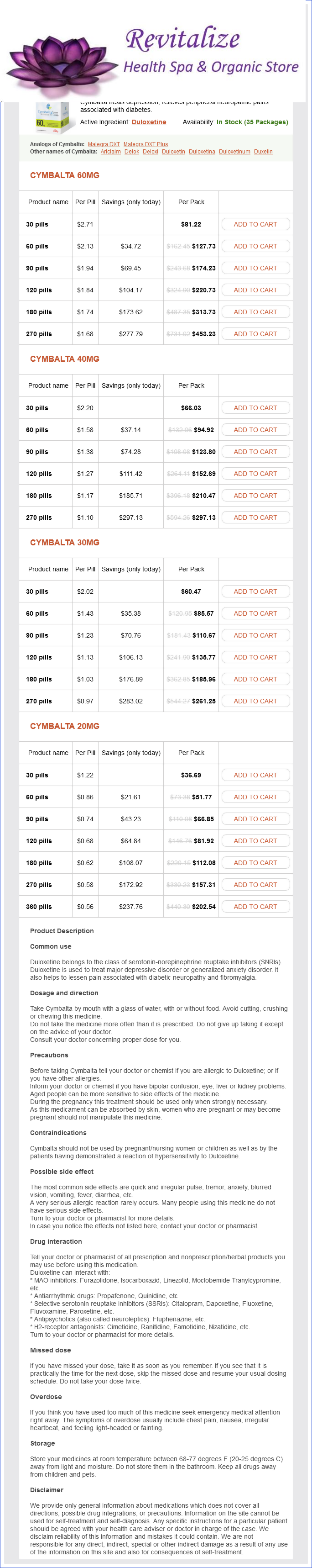 Cymbalta packs: 30 pills, 60 pills, 90 pills, 120 pills, 180 pills, 270 pills, 360 pills