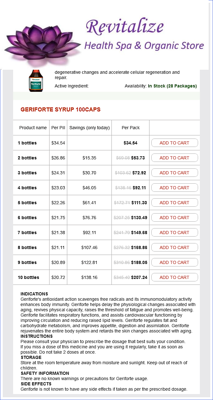 One small panel of 5 to 50 genes can be used for each tumor type and assayed at once herbs mentioned in the bible order geriforte syrup 100 caps on-line, currently within about 3 days everyuth herbals skin care products 100 caps geriforte syrup purchase with mastercard. Improved management of cancer treatment for genotyping patient-specific tumors and mutations as well as guiding treatment options. A new next-generation antibody-independent technology has recently been developed. Future applications of this technology are being explored to facilitate implementation of personalized medicine with improved clinical outcomes. Much of the improvement in outcomes is due to new surgical procedures and radiation treatments, particularly in some tumor types such as gliomas. Many different modes of therapy, including angiogenesis inhibitors, which keep tumors from building new blood vessels to supply themselves with food and oxygen, have demonstrated effectiveness in the treatment of cancer. Identification of Somatic Mutations the genetic fingerprint reveals the somatic alteration of cancer genomes. Genetic changes that are associated with cancer include a single nucleotide change or structural chromosomal changes. This allows for better detection of changes occurring in only a small number of cells. Chemotherapeutic Agents Chemotherapy drugs are used in cancer therapy for cure, palliation, and research to develop more effective therapy. The mechanisms of drug action are linked to the mitotic cell cycle; thus antitumor drugs may be placed in the following three classes: · Cell cycle active, phase specific · Cell cycle active, phase nonspecific · NonÂcell cycle active Improved Management of Cancer Treatment Accurate diagnosis of cancer, including leukemias, is dependent on accurate molecular profiling. Chemotherapy Proliferation Dormant cells within subclones survive chemotherapy, while the remaining cells are lost Cell Cycle Active, Phase Nonspecific Drugs in the cell cycle active, phase-nonspecific category are intercalating agents, alkylating agents, and 5-fluorouracil. Examples of intercalating agents are anthracyclines (adriamycin, daunomycin, idarubicin, mitoxantrone) and actinomycin D (dactinomycin; Cosmegen, Lyovac). NonÂCell Cycle Active Drugs in the nonÂcell cycle active category can be divided into five types: alkylating agents, l-asparaginase, corticosteroids, hormone antagonists, and miscellaneous. This interference is not only cytotoxic but also potentially mutagenic and carcinogenic. The consequences are inhibition of T-cell activation, activation and recruitment of monocytes and neutrophils, and inhibition of the migration of cells to the site of inflammation. The steroids used in cancer oncology include glucocorticoids (prednisone), estrogens (diethylstilbestrol), androgens (testosterone propionate), and progestational agents (medroxyprogesterone, megestrol acetate). Cytokines Cytokines constitute another group of cancer chemotherapy drugs (see Chapter 5). Each clone (depicted by the different colors) contains a mixture of cells that vary with respect to their stemness and/or proliferative ability, including relatively dormant cells. Together these factors represent the functional diversity present within single genetic subclones.