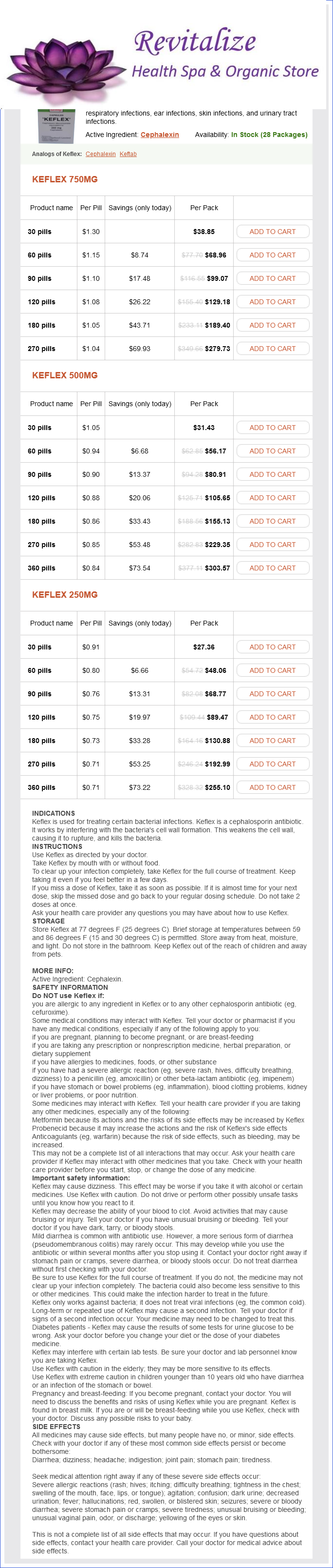 Keflex packs: 30 pills, 60 pills, 90 pills, 120 pills, 180 pills, 270 pills, 360 pills