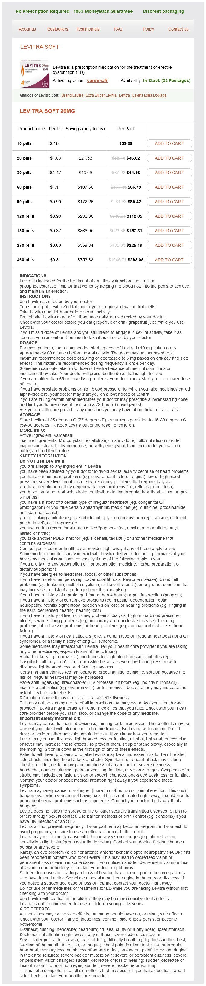 Levitra Soft packs: 10 pills, 20 pills, 30 pills, 60 pills, 90 pills, 120 pills, 180 pills, 270 pills, 360 pills