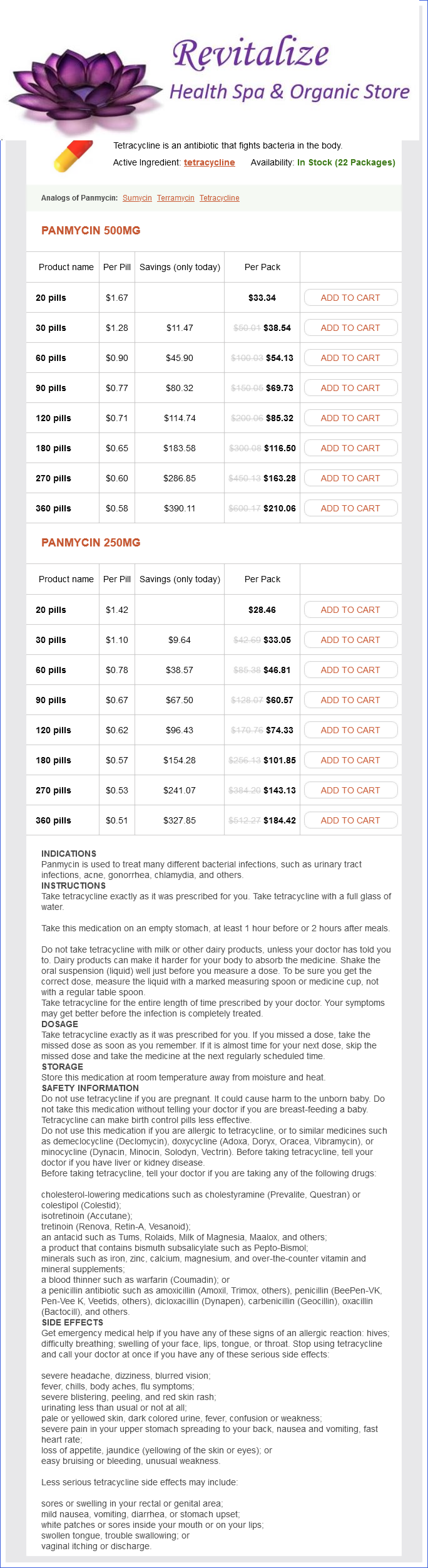 Panmycin packs: 20 pills, 30 pills, 60 pills, 90 pills, 120 pills, 180 pills, 270 pills, 360 pills