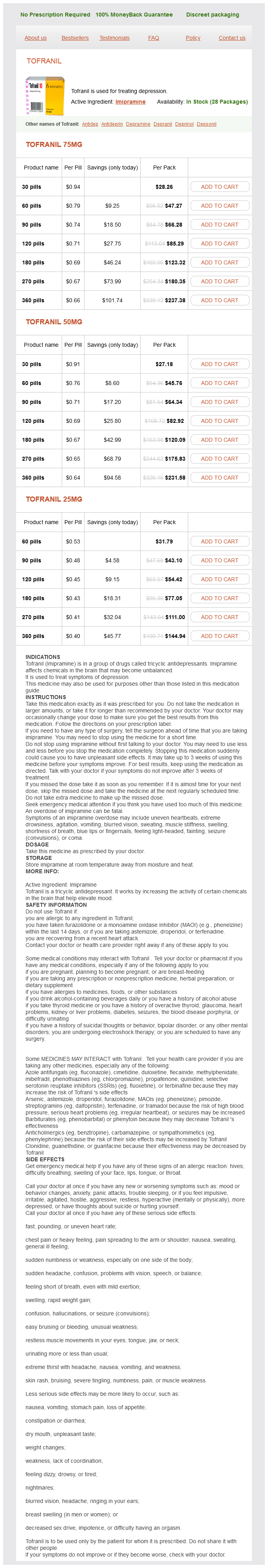 Tofranil packs: 30 pills, 60 pills, 90 pills, 120 pills, 180 pills, 270 pills, 360 pills