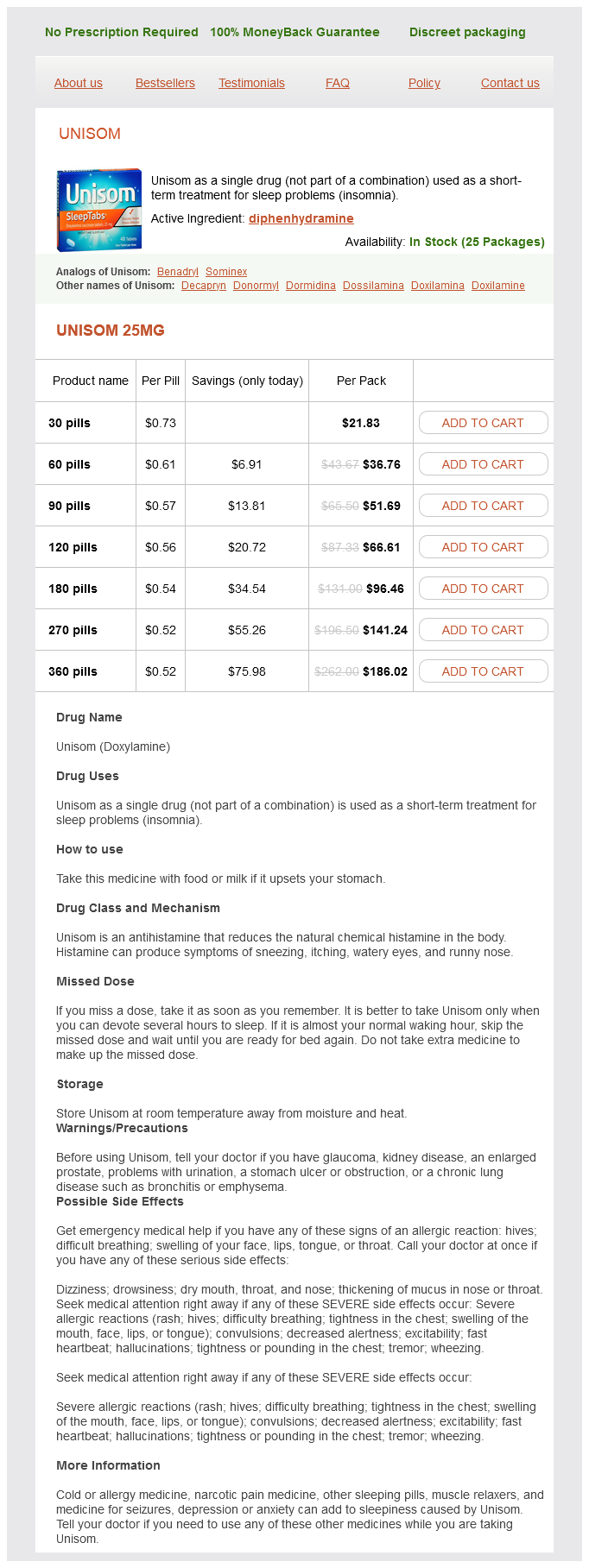 Long-acting neuraminidase inhibitor laninamivir octanoate versus oseltamivir for treatment of influenza: a double-blind insomnia 2012 buy discount unisom 25 mg, randomized sleep aid mouthpiece unisom 25 mg order online, noninferiority clinical trial. Effect of a single inhalation of laninamivir octanoate in children with influenza. Biota reports top-line data from its phase 2 "Igloo" trial of laninamivir octanoate. Meta-analysis: convalescent blood products for Spanish influenza pneumonia: a future H5N1 treatment A neutralizing antibody selected from plasma cells that binds to group 1 and group 2 influenza A hemagglutinins. Broadly neutralizing antibodies and the promise of universal vaccines: where are we now Efficacy and safety of aerosolized ribavirin in young children hospitalized with influenza: a doubleblind, multicenter, placebo-controlled trial. Inhibition of influenza hemagglutinin with the antiviral inhibitor arbidol using a proteomics based approach and mass spectrometry. Triple-combination antiviral drug for pandemic H1N1 influenza virus infection in critically ill patients on mechanical ventilation. Protection against a lethal H5N1 influenza challenge by intranasal immunization with virus-like particles containing 2009 pandemic H1N1 neuraminidase in mice. Respiratory syncytial virus infection in patients with hematological diseases: single-center study and review of the literature. Type A, Asian strain, as studied by light and electron microscopic examination of bronchoscopic biopsies. Morning vaccination enhances antibody response over afternoon vaccination: A cluster-randomised trial. Coinfections of Mycoplasma pneumoniae and Legionella pneumophila with influenza A virus. Inhibition of human natural killer cell activity by influenza virions and hemagglutinin. The frequency of influenza and bacterial coinfection: a systematic review and meta-analysis. Influenza Vaccination Coverage Among Health Care Personnel-United States, 2014Â15 Influenza Season. Emerging influenza viruses and the prospect of a universal influenza virus vaccine. Structure of the uncleaved human H1 hemagglutinin from the extinct 1918 influenza virus. A mutation on influenza C virus M1 protein affects virion morphology by altering the membrane affinity of the protein. Use of intravenous zanamivir after development of oseltamivir resistance in a critically Ill immunosuppressed child infected with 2009 pandemic influenza A (H1N1) virus.