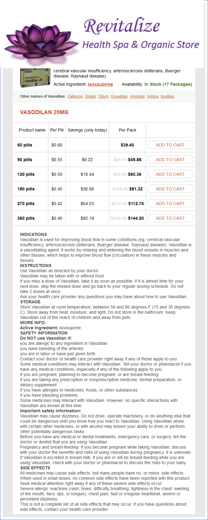 Vasodilan packs: 60 pills, 90 pills, 120 pills, 180 pills, 270 pills, 360 pills