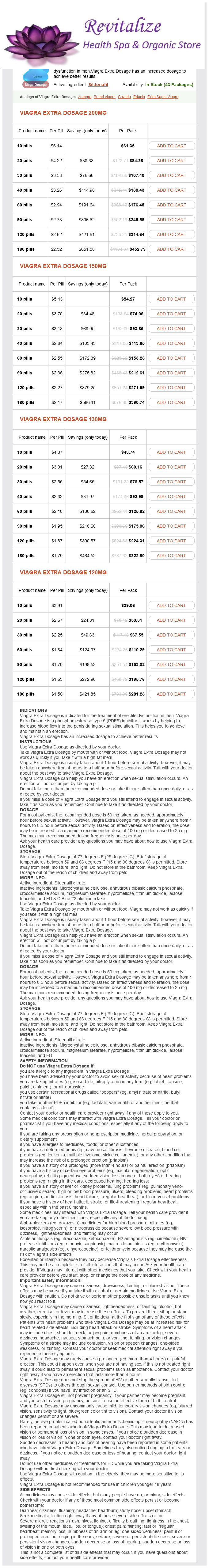 Viagra Extra Dosage packs: 10 pills, 20 pills, 30 pills, 40 pills, 60 pills, 90 pills, 120 pills, 180 pills