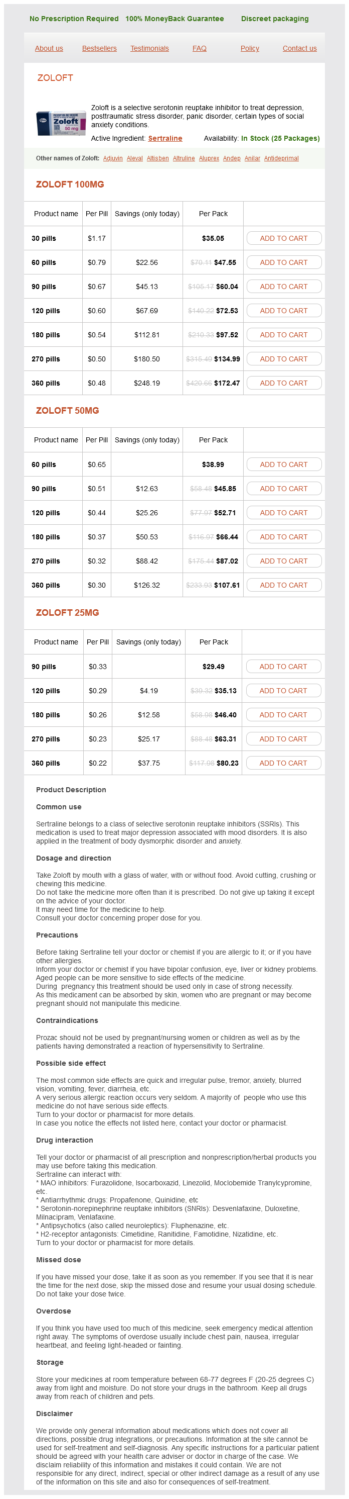 Zoloft packs: 30 pills, 60 pills, 90 pills, 120 pills, 180 pills, 270 pills, 360 pills